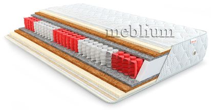 Наполнение: натуральный латекс, кокосовая койра, мягкий войлок, пружинный блок Pocket Spring, мягкий войлок, кокосовая койра, натуральный латекс, еврокаркас