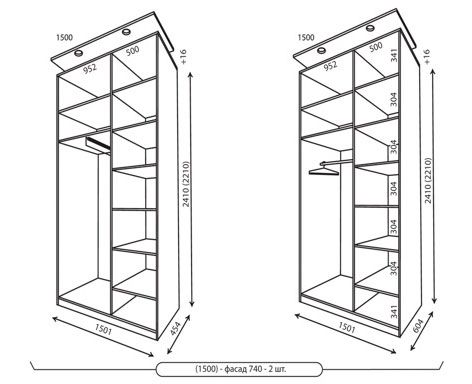 ширина: 1500 мм, глубина: 450/600 мм, высота: 2200/2400 мм.